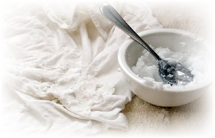 Одежда раскладывается на ровной поверхности, загрязнение посыпается содовым пятн. Сверху кладется тонкая бумага. Гладить одежду нужно через бумагу негорячим утюгом. Потом сверху кладется груз примерно на полдня.